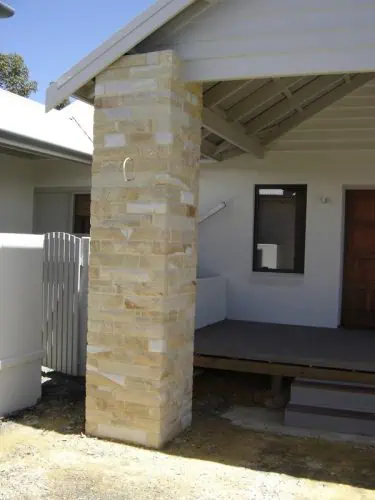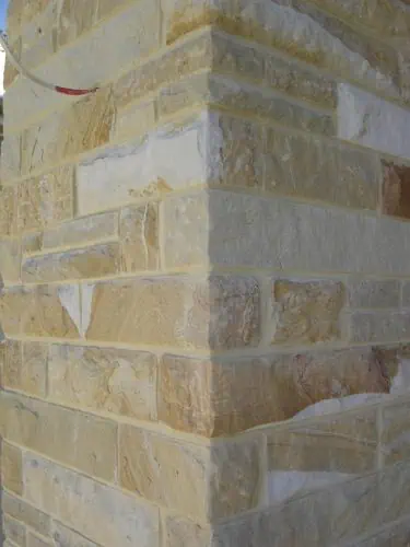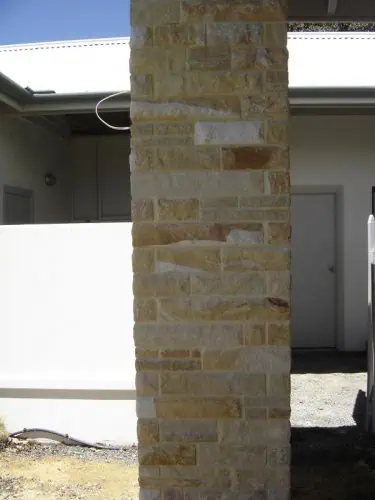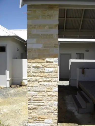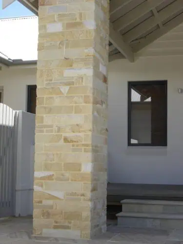 These pillars grace the entrance of a residential home in Eagle Bay and were created with Donnybrook Sandstone sawn blocks with a chiselled rock face. These blocks are 100-120mm thickness and can be used as second skin for housing, fireplaces and as pillars as seen in this example. All blocks are laid horizontally to create a layered 'book leaf' appearance. The colour palate of the sandstone in this project is referred to as the Rural Stone mix - alternative variations in colour can be specified.